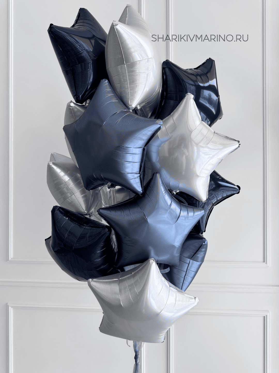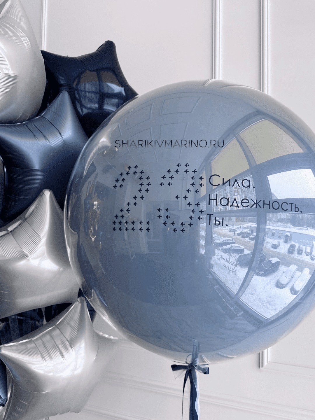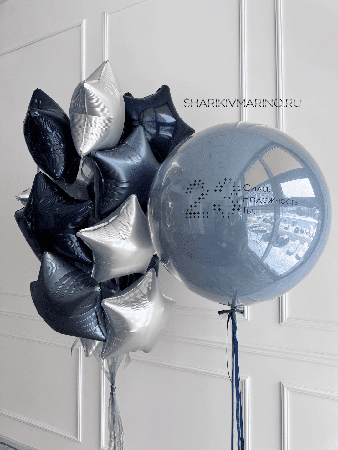 Представьте идеальный подарок к 23 Февраля — стильную композицию из воздушных шаров. Центр композиции занимает большой прозрачный шар с элегантной надписью «23. Сила. Надежность. Ты», подчеркивающей мужество и достоинство мужчины. Вокруг него мерцают черные и серебряные звезды, создавая образ величия и надежности.
