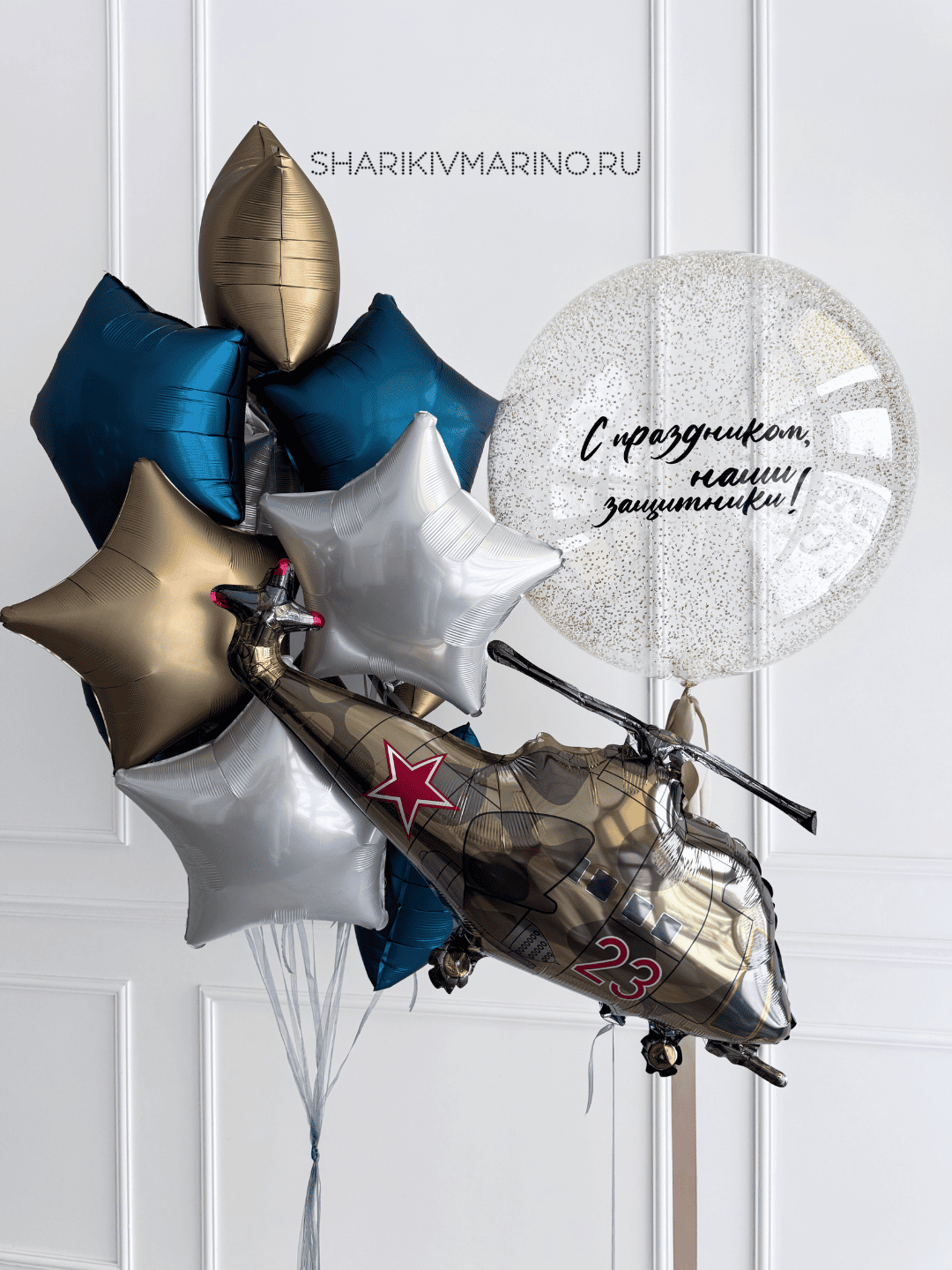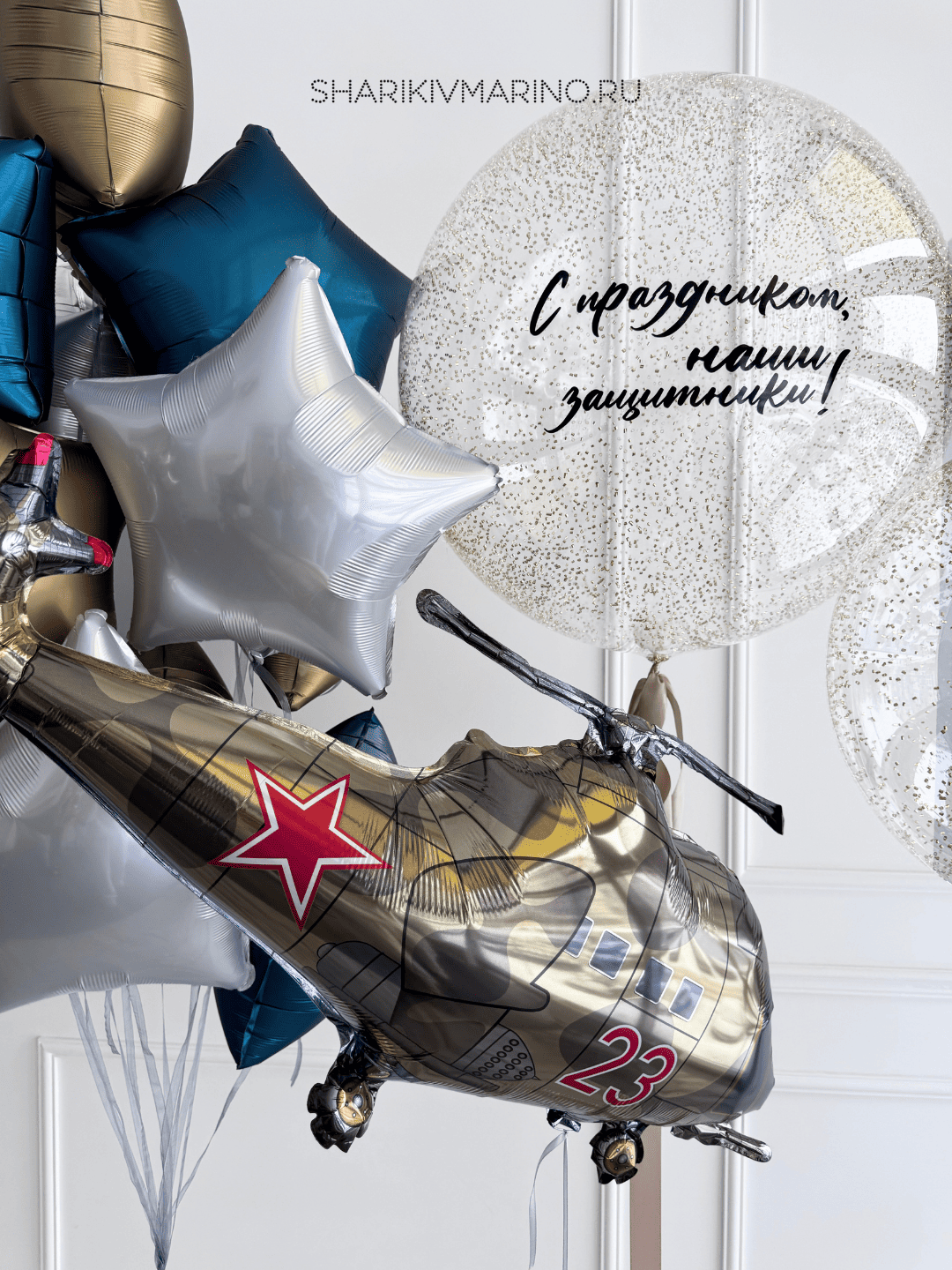 Ищете способ сделать праздник 23 февраля по-настоящему запоминающимся? Представляем эксклюзивную композицию из воздушных шаров, воплощающую дух мужества и патриотизма! В центре композиции — эффектный фольгированный вертолёт в камуфляжной расцветке. Детализация поражает: красная звезда, символизирующая доблесть, и яркая цифра «23» подчёркивают тематику праздника.