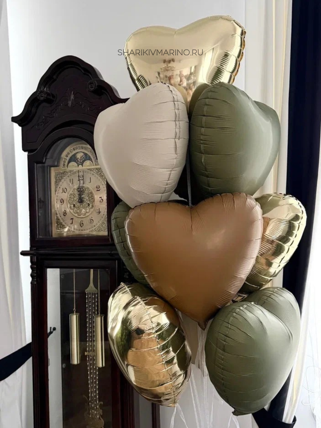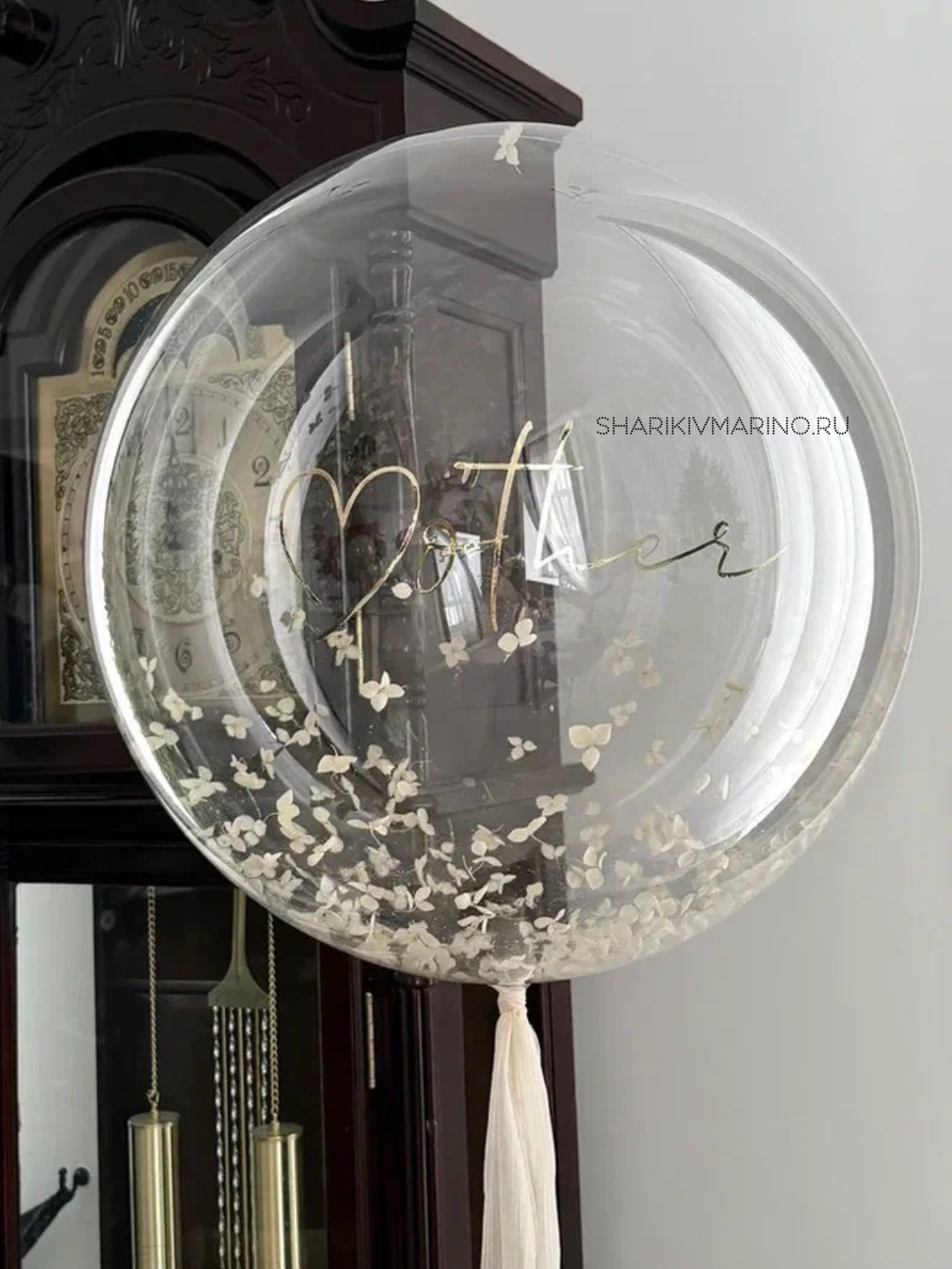 В центре композиции — изысканный шар‑баблс, внутри которого бережно размещена стабилизированная гортензия. Нежный цветок сохраняет свою природную красоту надолго, символизируя неизменность вашей любви и благодарности. Рядом с шаром — эффектный фонтан из фольгированных сердец, создающий праздничное настроение и добавляющий композиции романтичный акцент.
