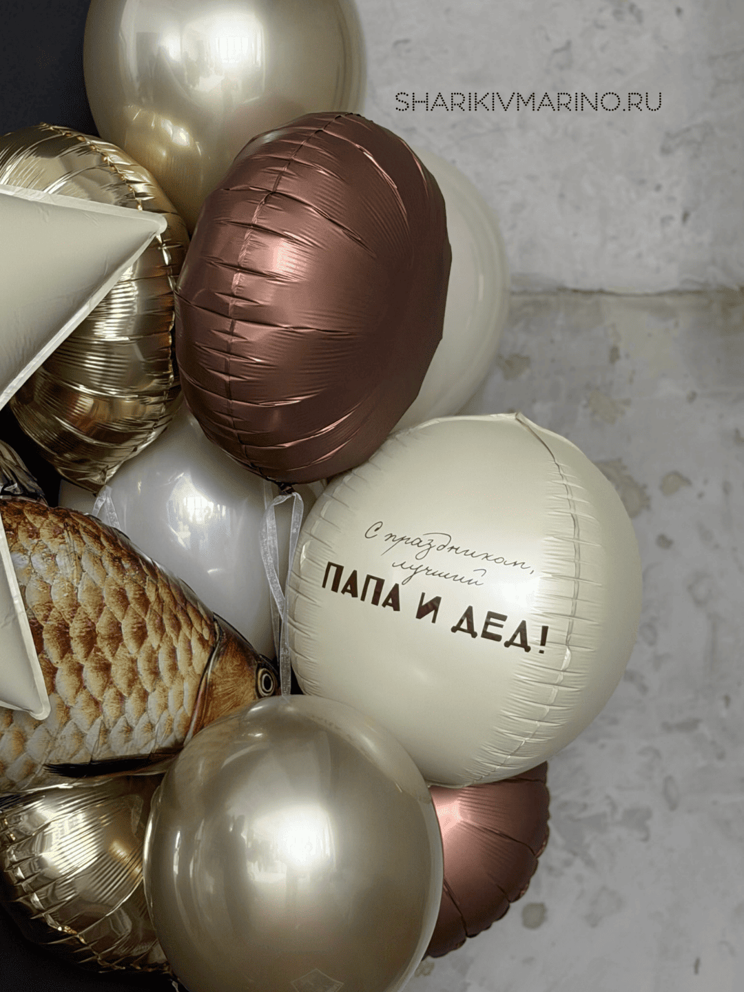 В центре композиции — внушительная звезда с остроумным определением: «Добытчик (сущ.) — мужчина, который «я всё решу» и картой без лимита». Вокруг неё — гармоничное сочетание золотисто-бежевых шаров, реалистичного шара в виде рыбы и трогательного послания: «С праздником, лучший папа и дед!».