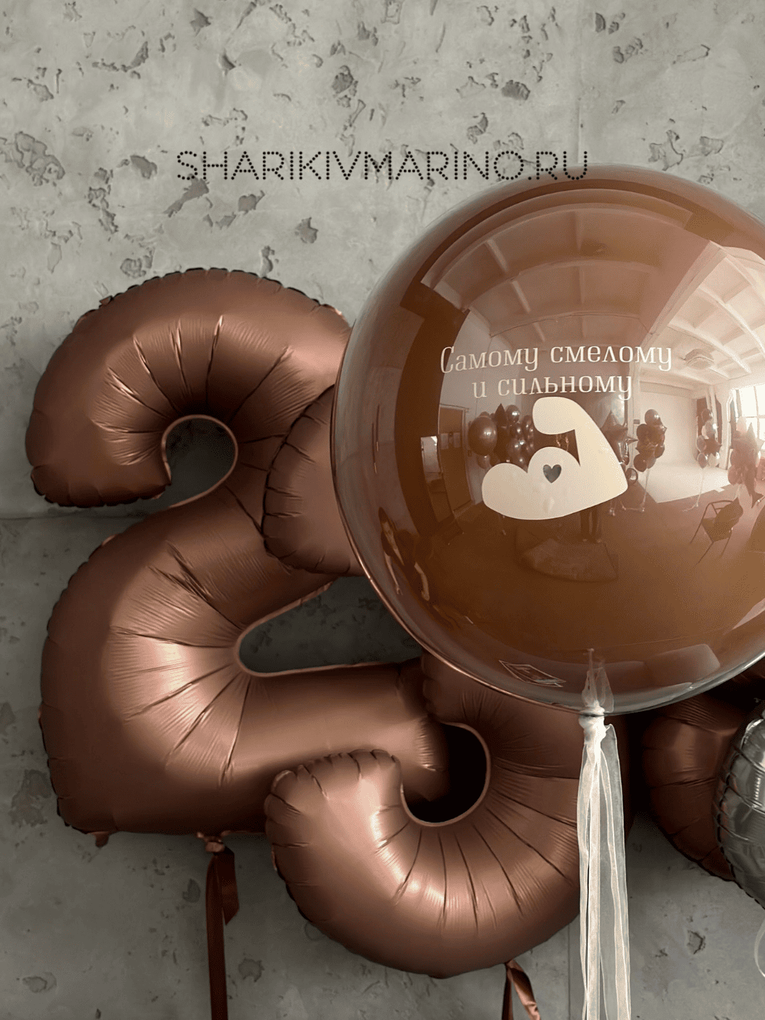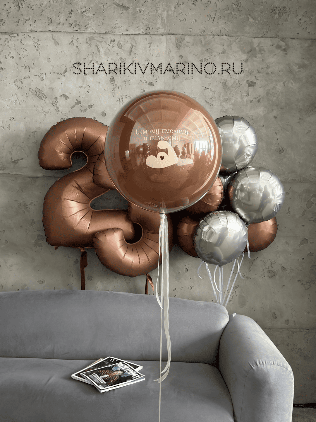 В центре композиции — крупный прозрачный шар с трогательной надписью «Самому смелому и сильному» и милым силуэтом. Его окружают элегантные шары шоколадного и серебристого цветов, включая впечатляющий шар-цифру «23», который задаёт торжественный тон.