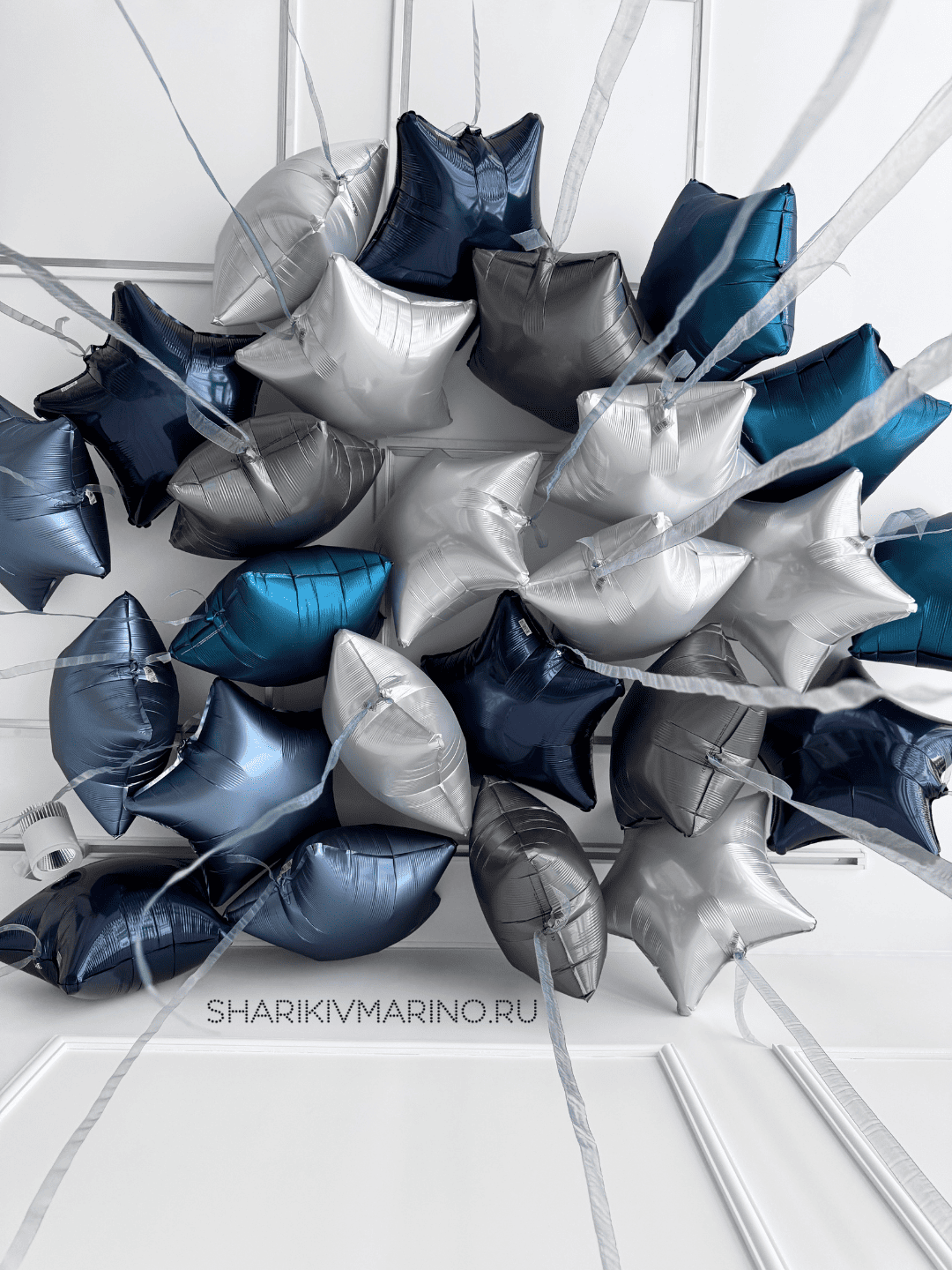 Сочетание глубоких оттенков синего, серебристого и серого создаёт эффектный, утончённый образ — словно звёздное небо спустилось в ваш зал. Блестящая поверхность шаров придаёт композиции особый шарм и торжественность, а аккуратные ленты добавляют лёгкости и динамики.