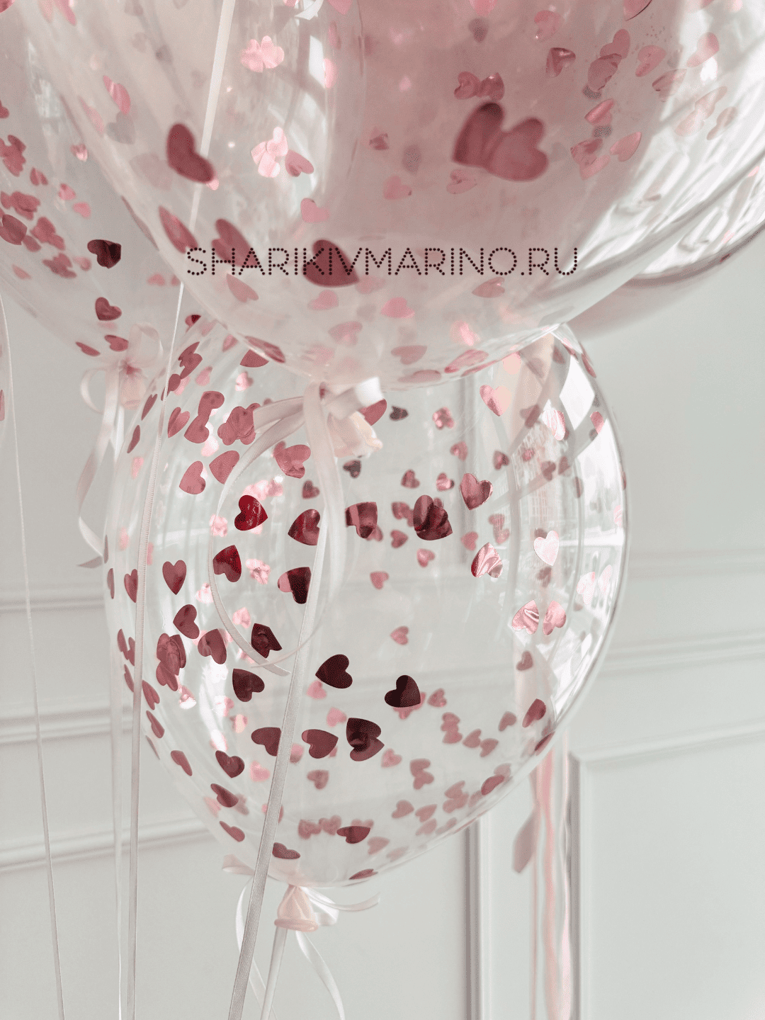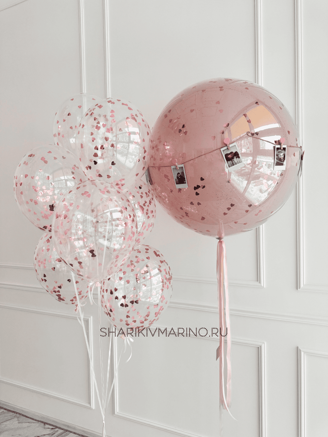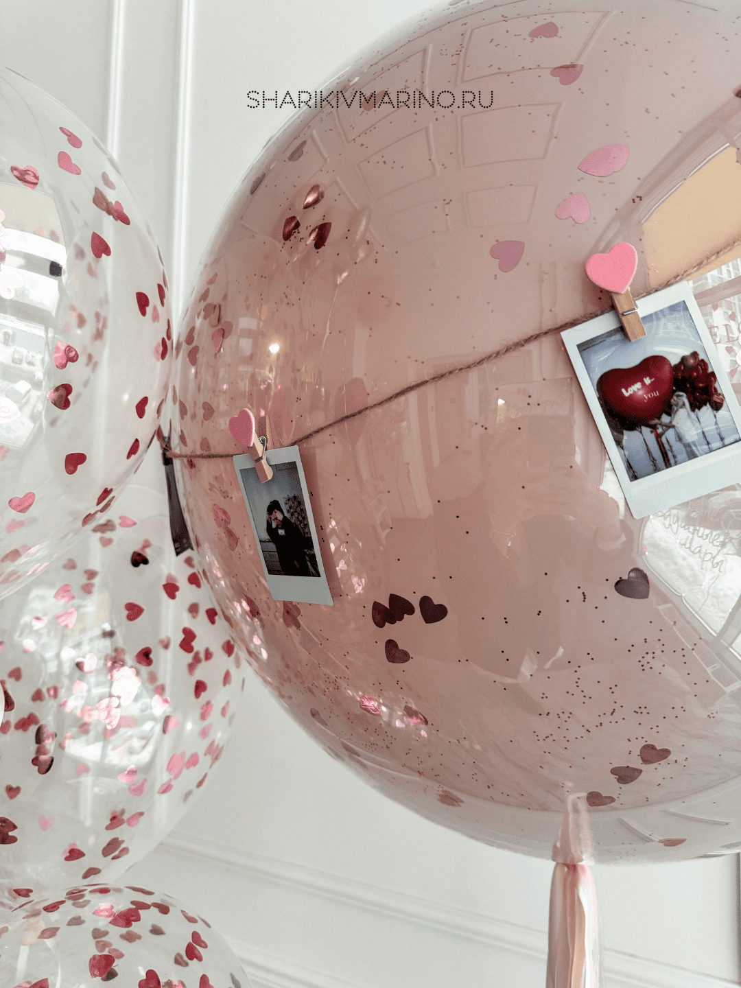 Розовый шар-гигант и фонтан из шариков с конфетти на День Влюблённых