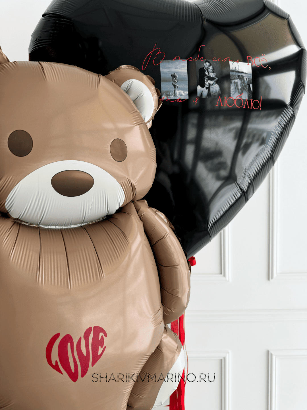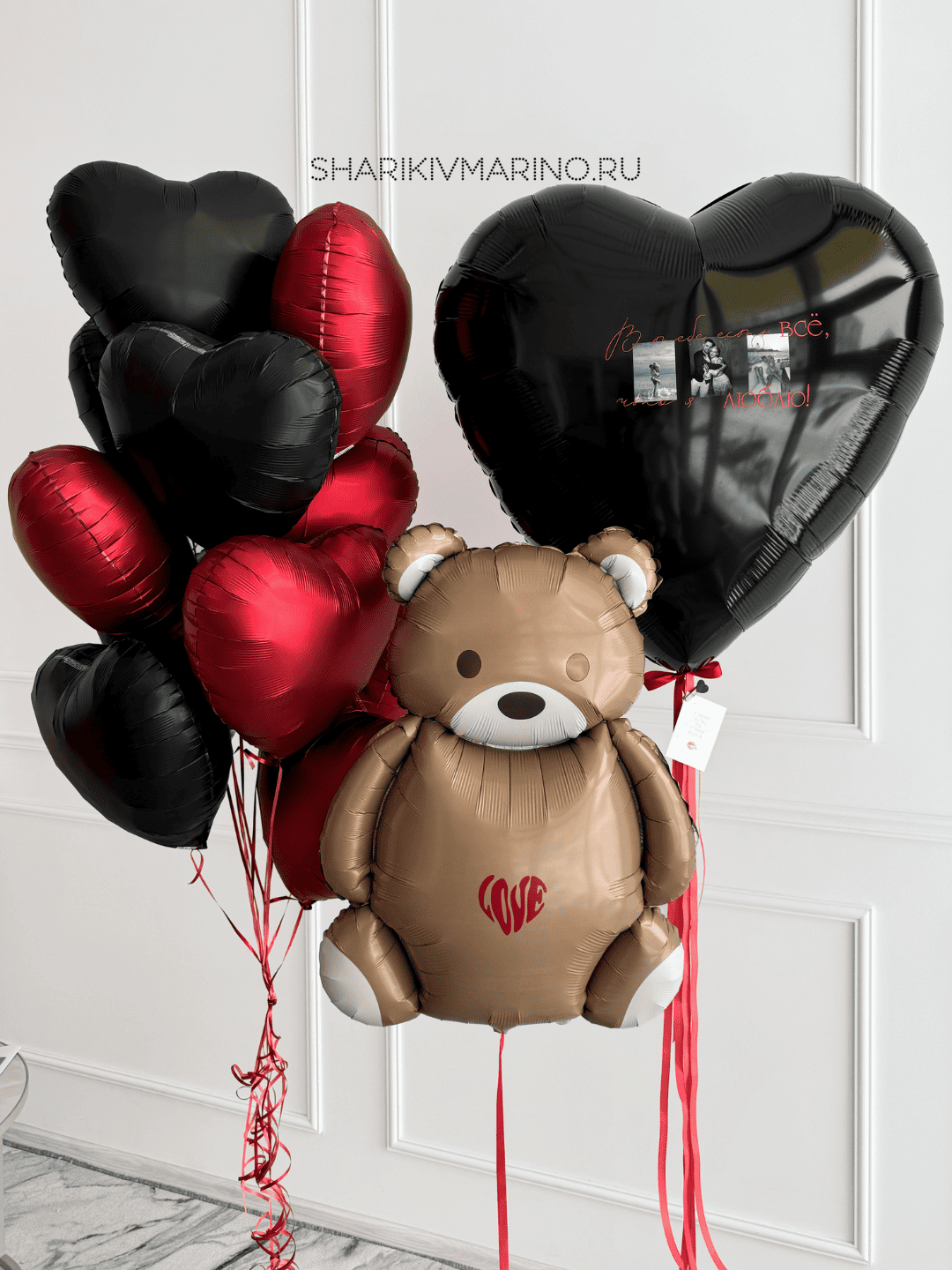 Очаровательный фольгированный мишка с надписью «Love» в окружении блестящих шаров-сердец. Контраст чёрных и красных шаров создаёт стильный образ. Идеальный подарок для романтического свидания или Дня святого Валентина. Долговечность фольги гарантирует сохранность композиции несколько дней.