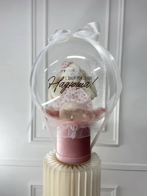 - Прозрачный шар-баблс с изящным атласным бантом — символ чистоты и искренности поздравлений. Глянцевая поверхность шара отражает свет, добавляя блеска и торжественности.