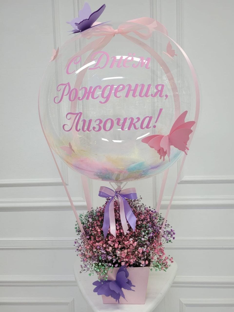 Композиция «С Днём Рождения» с живыми цветами и декоративными бабочками