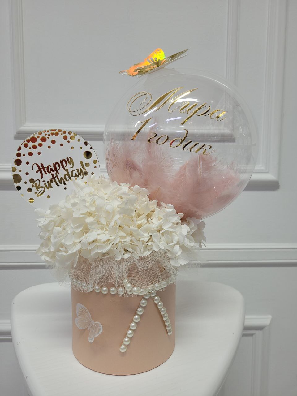 Цветочная композиция со стабилизированной гортензией для девочки на годик