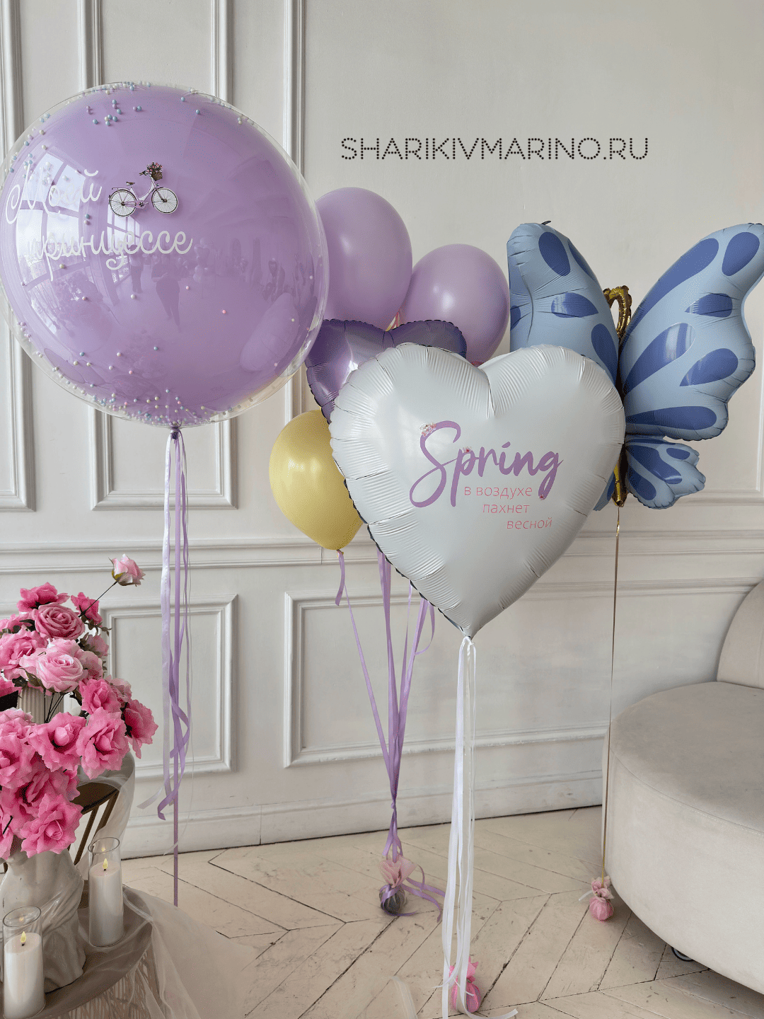 Нежные оттенки, словно нарисованные рассветом, изящные формы — сердце с надписью «Весна», воздушная бабочка, полупрозрачные шары с конфетти. Это не просто шары — это послание: «Ты — наша принцесса, ты заслуживаешь этого момента счастья».