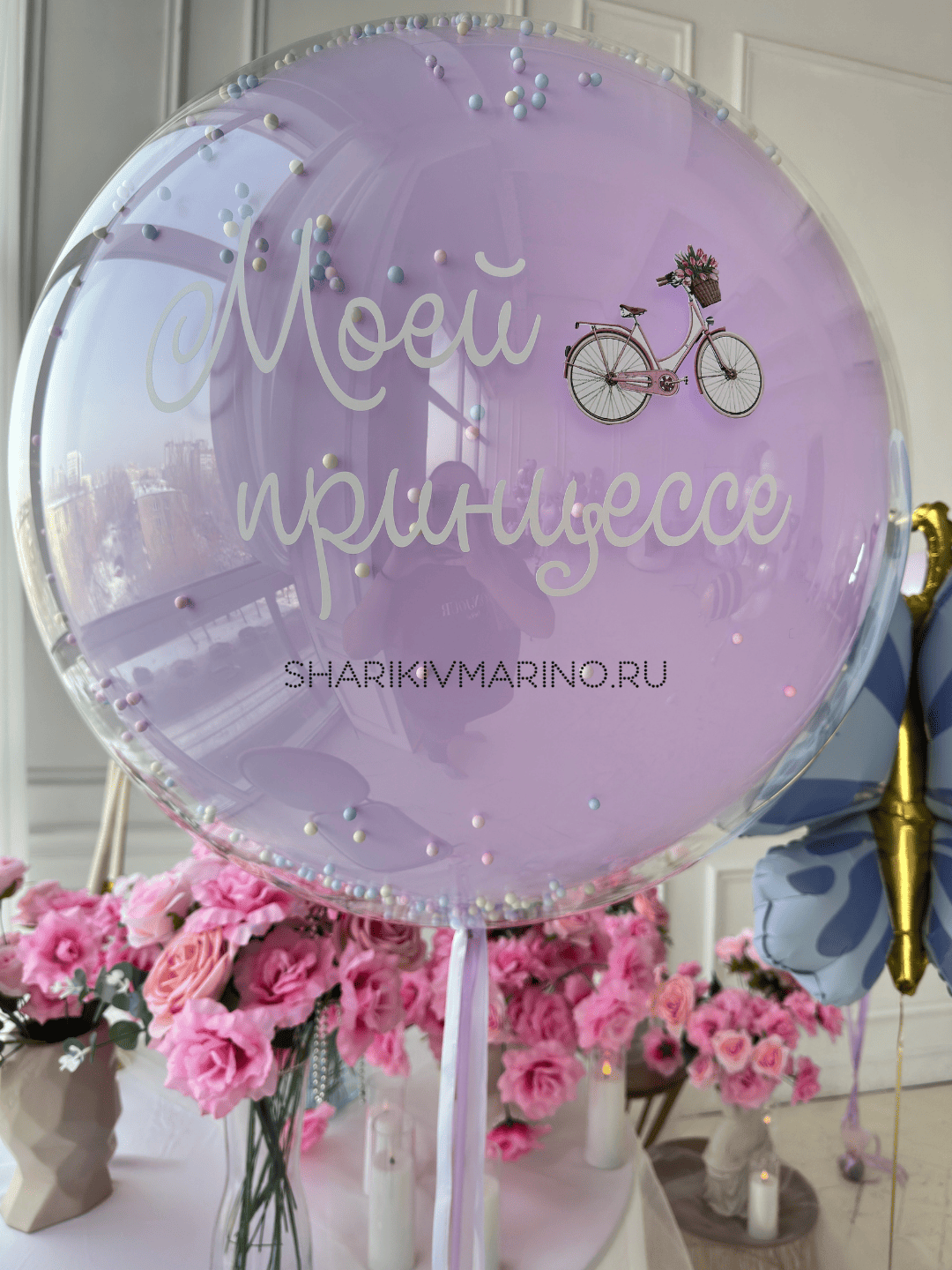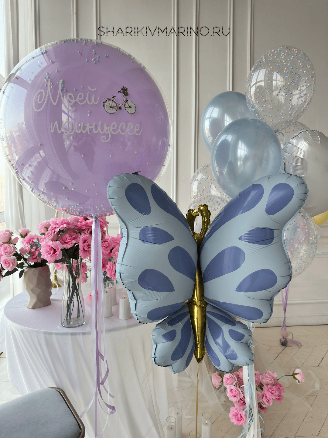 Лёгкая, как дуновение весеннего ветра, композиция завораживает с первого взгляда. В её центре — изящная фольгированная бабочка с золотым тельцем, словно парящая в воздухе. Рядом — полупрозрачный сиреневый шар с нежной надписью «Моей принцессе» и миниатюрным велосипедом, превращающим поздравление в личное послание.