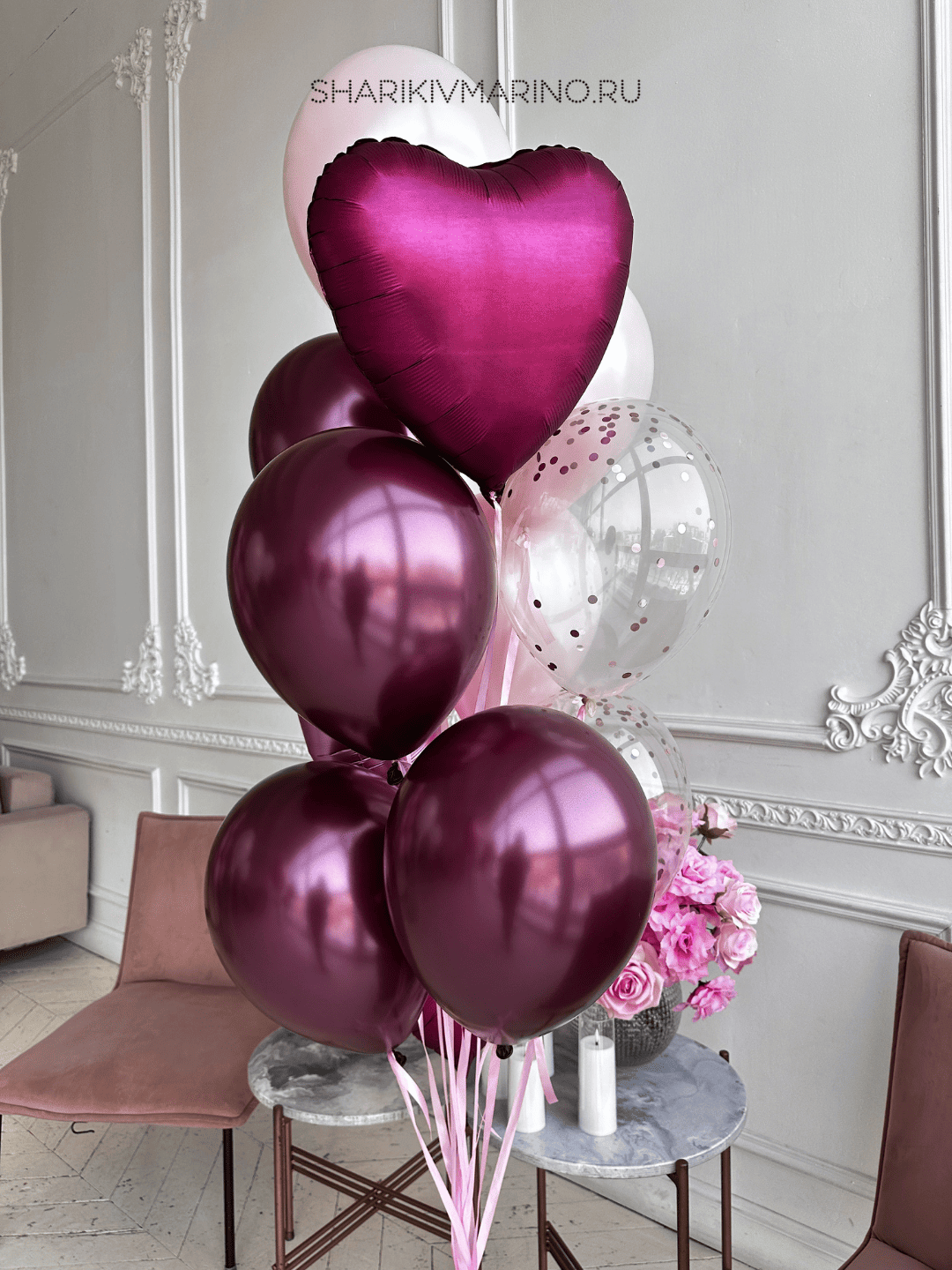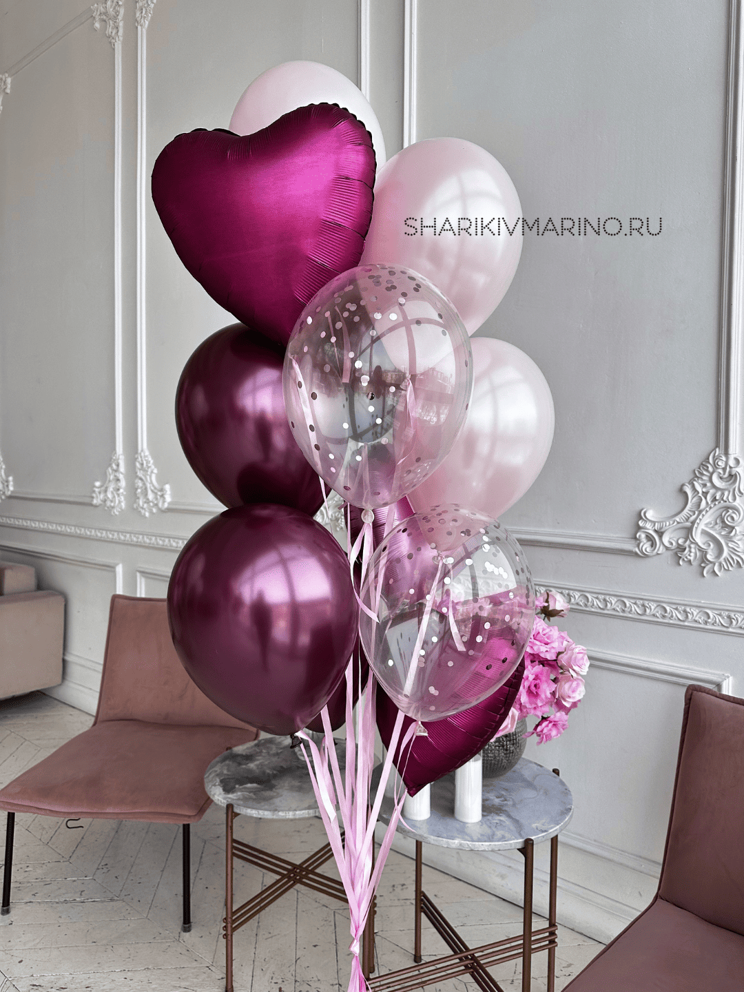 Позвольте себе окунуться в атмосферу утончённого праздника с нашей изысканной композицией из воздушных шаров. Сочетание глубоких бордовых и нежных пудровых оттенков создаёт неповторимый образ, который станет украшением любого события.