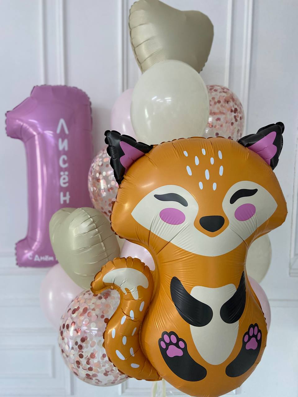 Подарите вашей малышке незабываемый первый День Рождение с этой нежной композицией из шаров! Фольгированная лисичка, разноцветные шарики и циферка с ее именем создадут атмосферу волшебства. Идеальная композиция для такого особенного праздника!