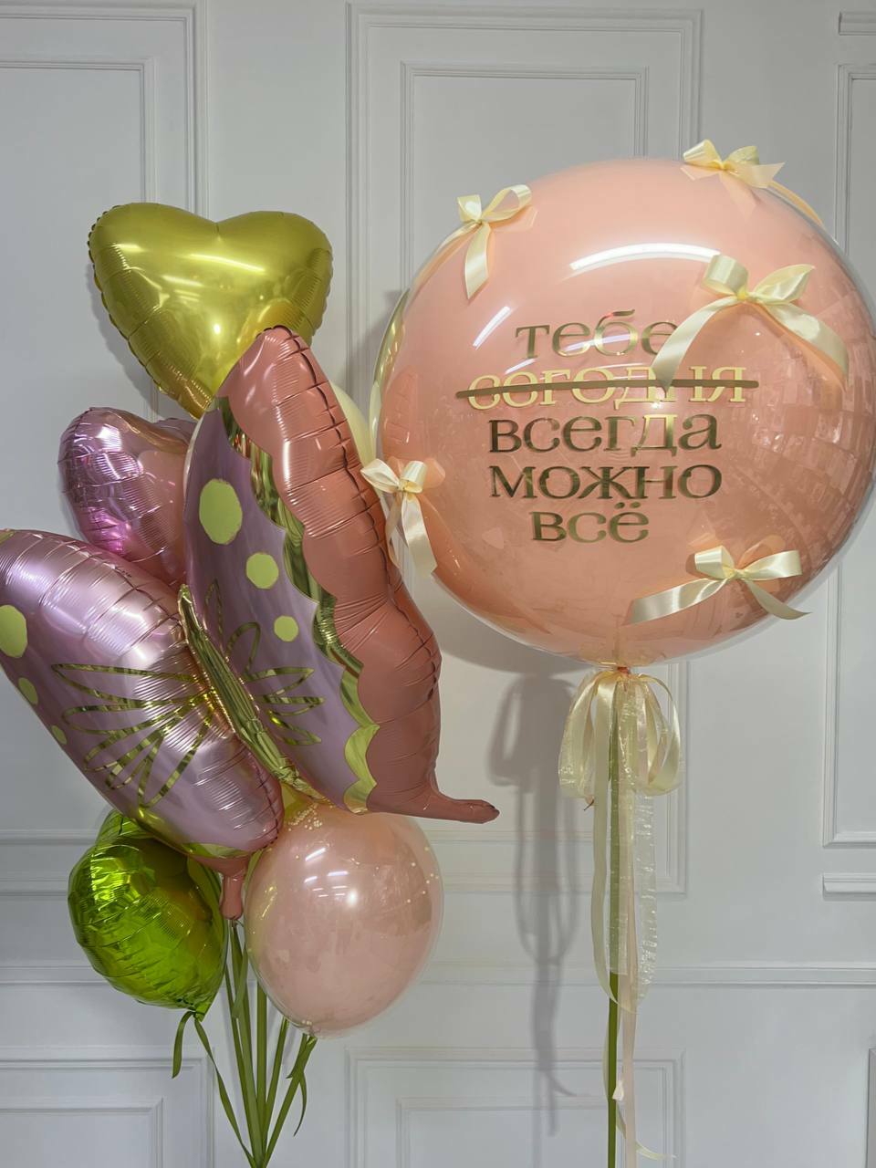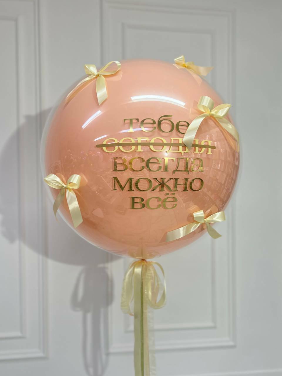 Прекрасный подарок для девушки - воздушная композиция с использованием стеклянного шара с бантиками, на котором будет нанесена ваша индивидуальная надпись. Персиковые и светло-жёлтые оттенки придадут композиции особую изящность и элегантность. Этот подарок не только порадует именинницу, но и останется ярким воспоминанием о празднике на много лет вперед. Подчеркните свою заботу и вкус при выборе этой композиции!