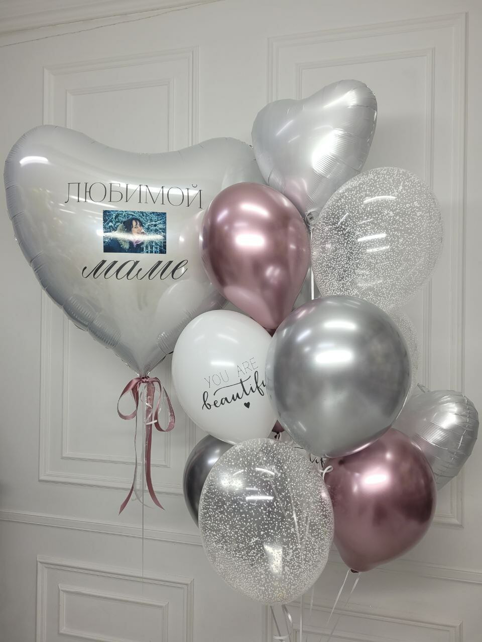 Большое сердце с вашей индивидуальной надписью и фотографией + фонтан из 13 шаров в бело-розовом цвете. В фонтан добавлены 2 сатиновых сердца для придания легкости и нежности всей композиции.