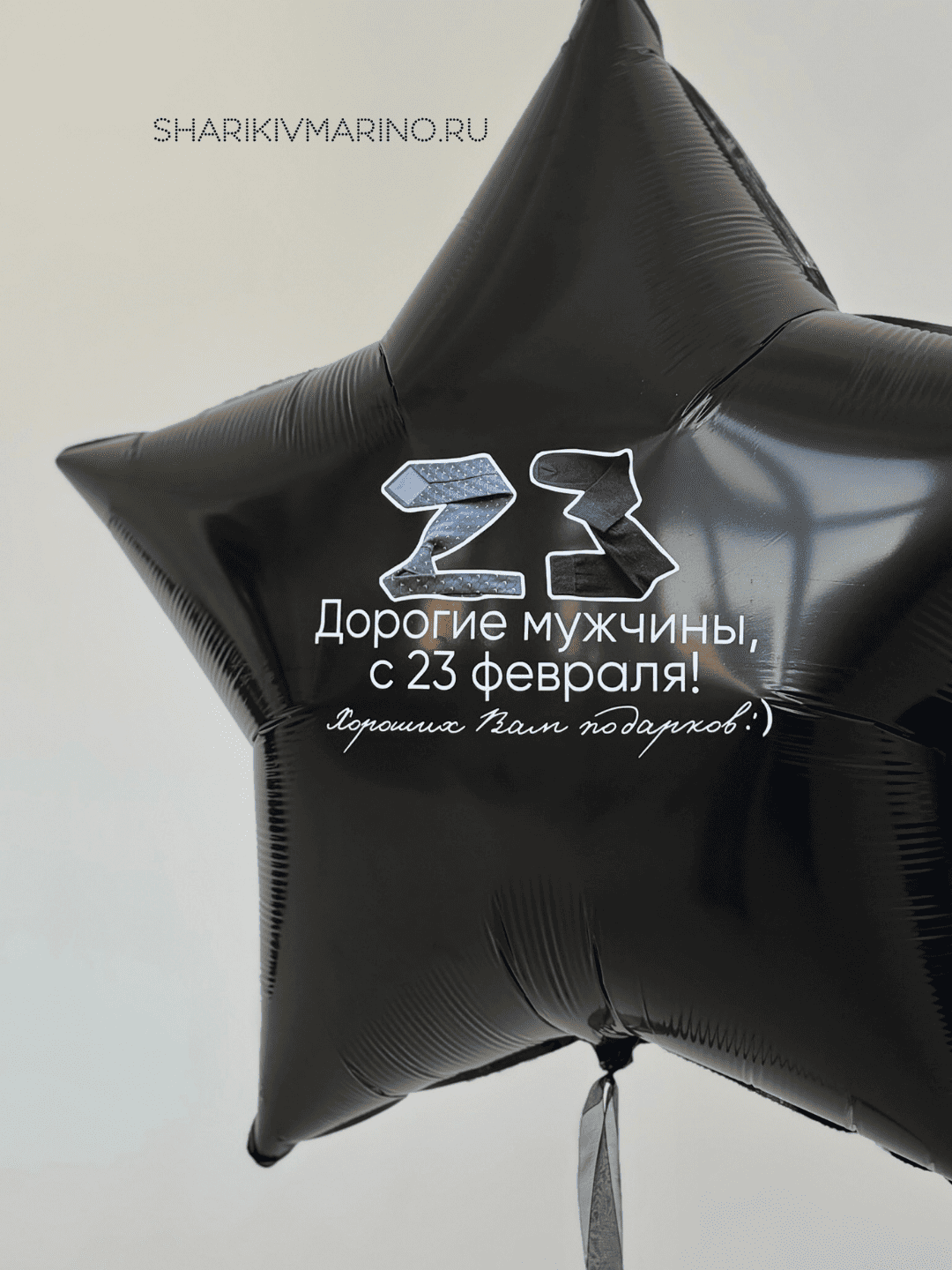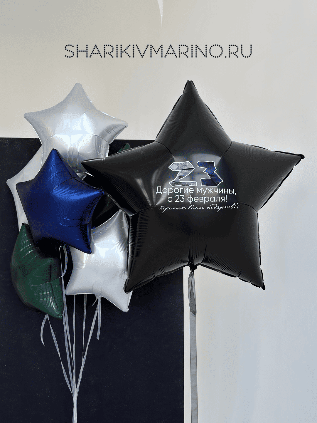 Ищете оригинальный способ поздравить дорогих мужчин с 23 Февраля?Предлагаем впечатляющую композицию из воздушных шаров! В неё входит эффектная чёрнаяфольгированная звезда с яркой надписью „Дорогие мужчины, с 23 февраля!“ и красочныйфонтан из фольгированных звёзд. Композиция подарит праздничное настроение и сделаетдень особенным. Оформите заказ прямо сейчас!